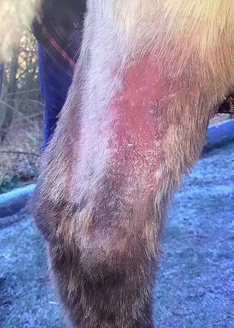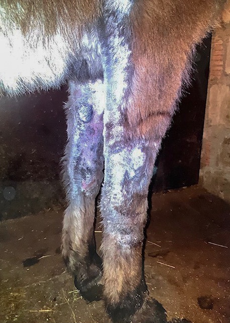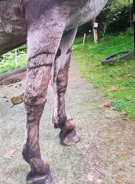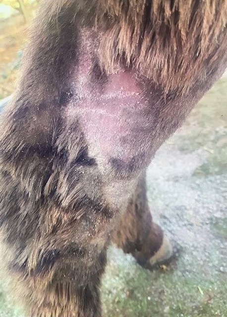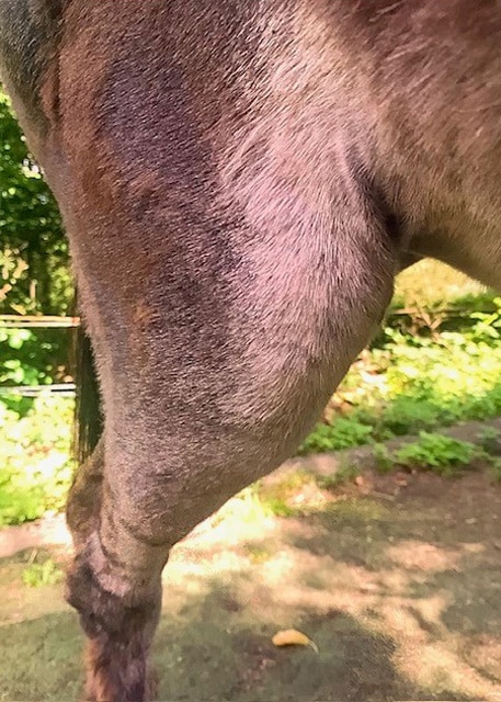Meine Eselin „Mia“ hatte über 3 Jahre extreme Hautprobleme und keine Behandlung hat wirklich geholfen. Sie bekam plötzlich haarlose Stellen und stark gerötete Flächen am ganzen Körper und dabei extreme Schuppenbildung. Vorallem betroffen waren die gesamten Beine außer die Fesselgelenke, die Bauchunterseite, Euter, Rücken und Po.